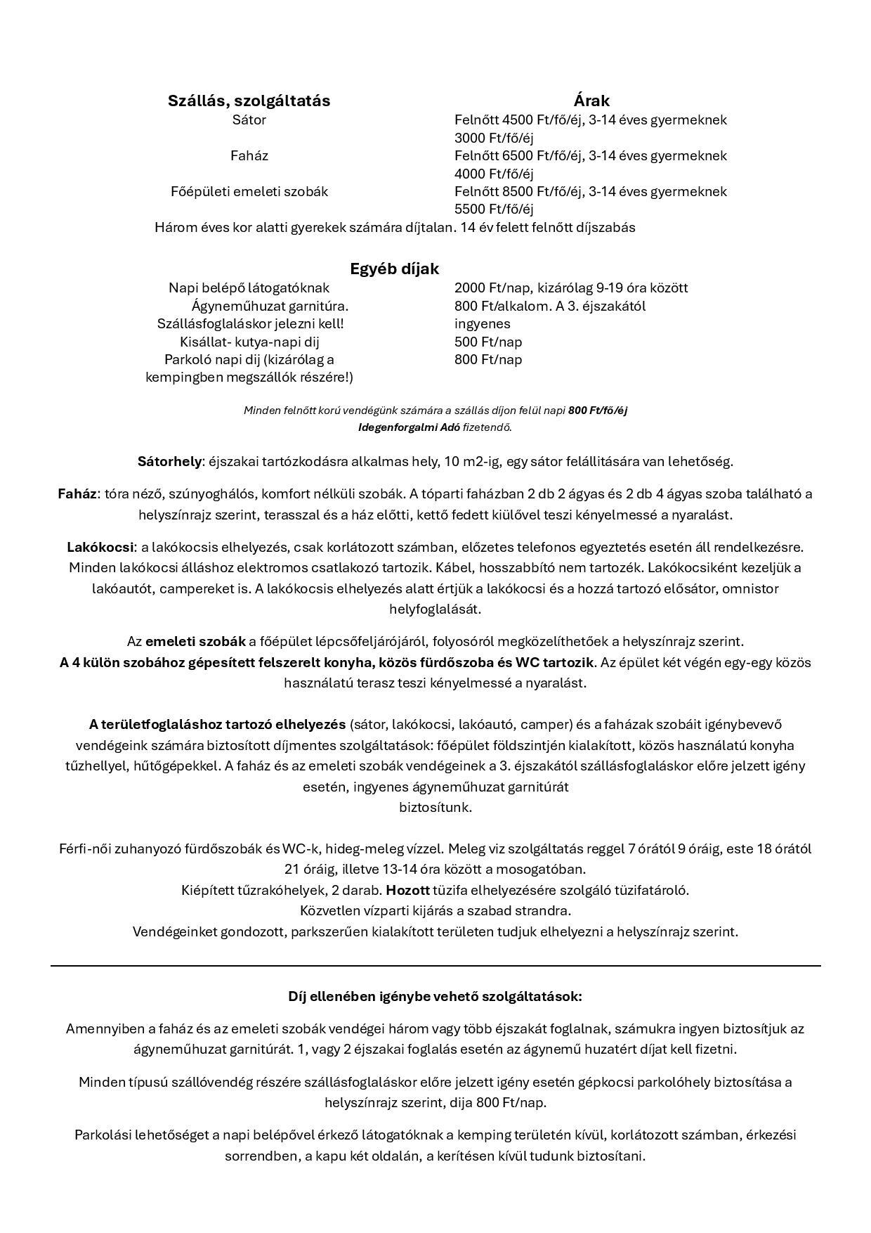 ☞ Az árak tartalmazzák: konyha használatot, benne a hűtők, tusolók és a WC-k használatát